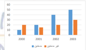 الرسم التالي يوضح نسبة المصابين بالسرطان من المخنين وغير المدخنين اوجد مجموع الاشخاص المصابين بالسرطان من المدخنين