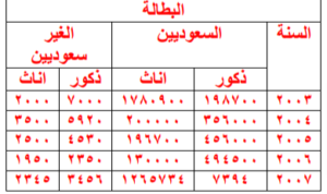 في أي عام كان عدد البطالة للذكور السعوديين اكبر ؟